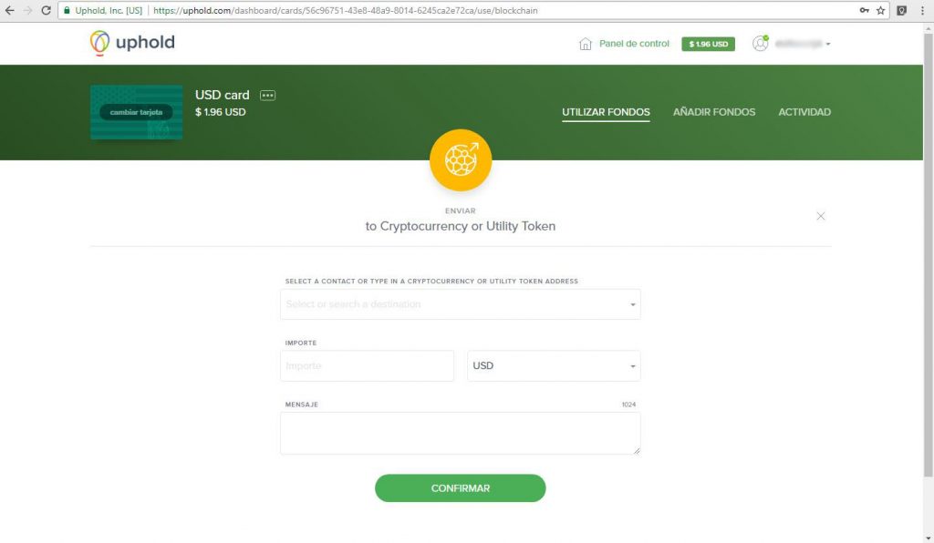 Al igual que al momento de transferir fondos, al final veremos los montos correspondientes a las comisiones y el total a recibir. En nuestro caso estamos enviando fondos desde nuestra tarjeta de dรณlares, hacia un monedero de bitcoin. Es por esto que nos da el precio actual en el que se cotiza un bitcoin al momento del envรญo, de acuerdo a la tasa de cambio de Uphold.