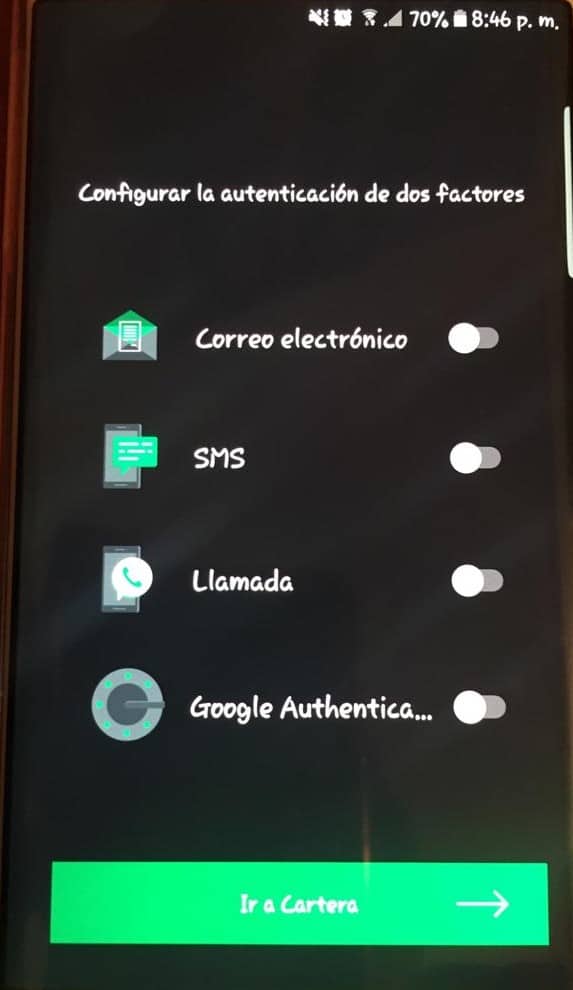 Ya para finalizar, la cartera nos ofrece configurar la autenticación de factores correspondiente al sistema de seguridad multifirma. Esta configuración es totalmente opcional, y puedes saltar este paso seleccionando sobre la opción Ir a Cartera, y utilizar tu monedero sin ningún tipo de problema.