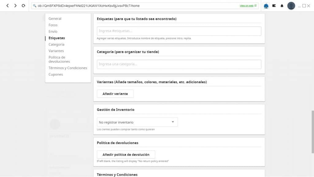 Éstas nos permitirán organizar nuestra mercancía en el buscador, y hacer que otros usuarios puedan encontrar nuestros productos de manera más rápida. El modo de ingresarlas consiste en escribir el nombre de la etiqueta y presionar Enter.